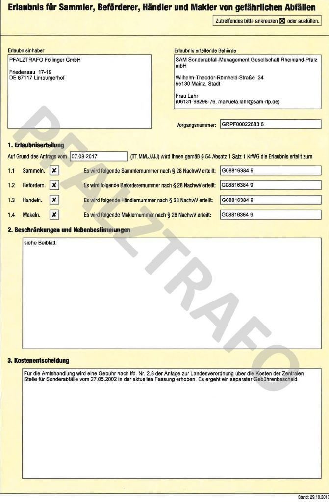 Diese Genehmigung regelt und überwacht die sichere Handhabung, den Transport und den Handel mit gefährlichen Abfällen gemäß den entsprechenden Vorschriften und Umweltstandards.
