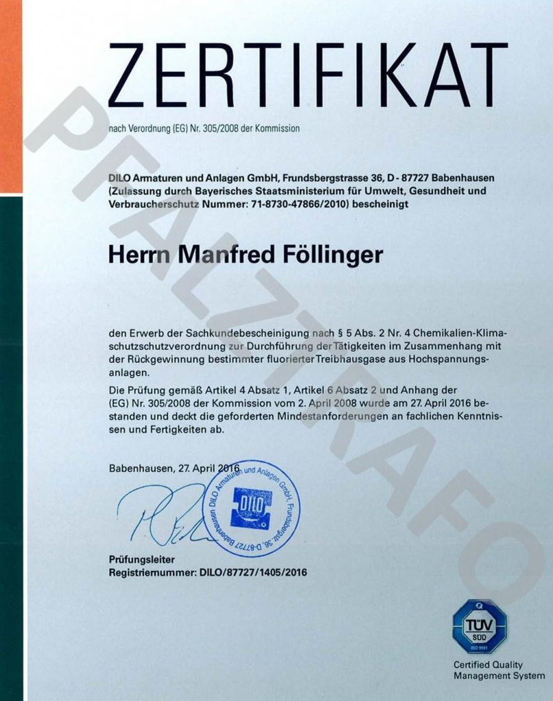 Unser Unternehmen verfügt über die entsprechende Zertifizierung und ist damit qualifiziert, Schwefelhexafluorid (SF₆) mit geeigneten Geräten sicher zu handhaben – insbesondere in Hochspannungsanlagen.