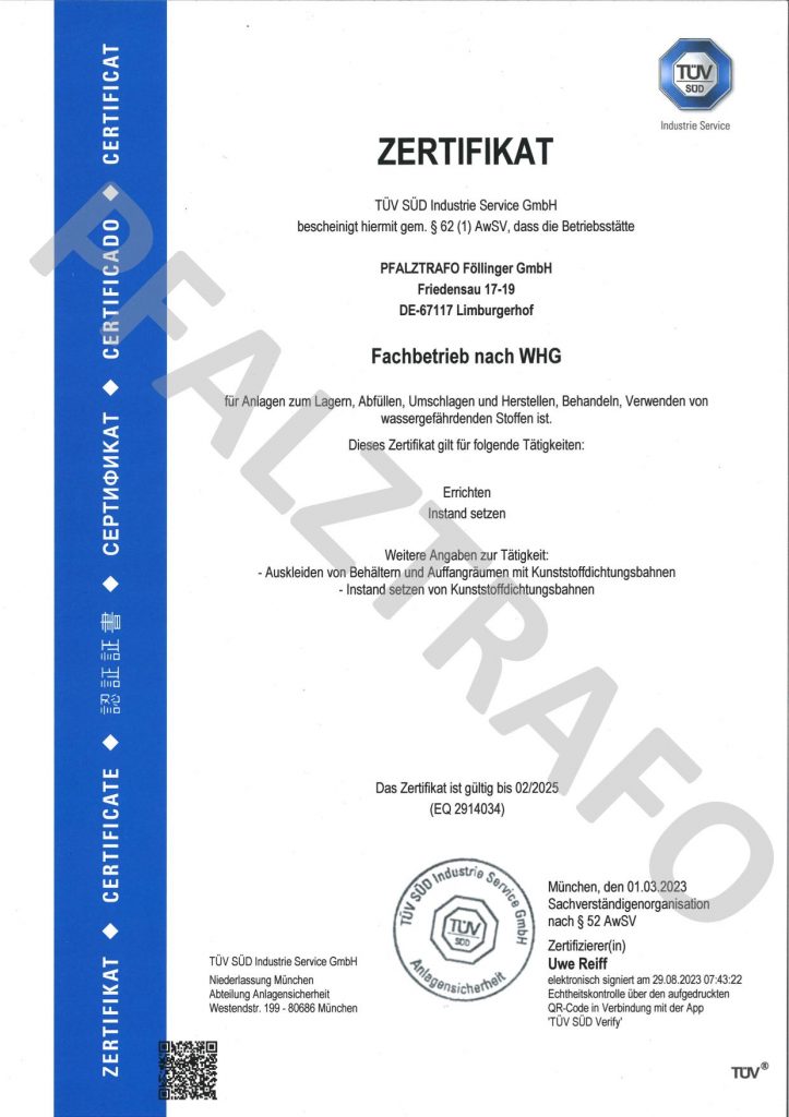 Unser Unternehmen verfügt über das Zertifikat nach dem Wasserhaushaltsgesetz (WHG), was unsere Expertise und Verpflichtung zu höchsten Standards in der sicheren Handhabung und Abdichtung von Ölauffangwannen belegt.